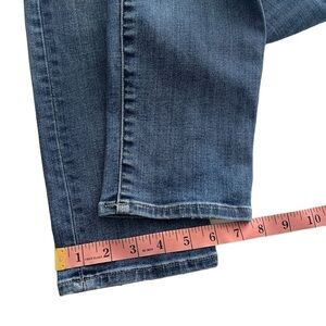 Gap Women's Resolution Slim Straight Jeans. Size 28s. Medium blue wash denim with distressing and small rips. Classic 5 pocket design. Zip fly and single button front closure. Approximate measurements as pictured. 87% cotton 12% polyester 1% elastane. Machine washable. Good used condition.