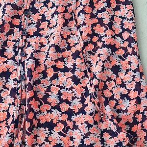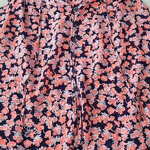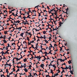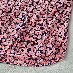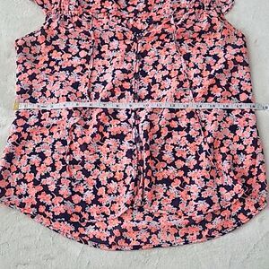 Gap Women's Small Flutter Style Cap Sleeve, Semi Sheer Fabric with Multicolor Floral Pattern in Navy Blue, Pink and Coral Colors. Bright and Beautiful Lightweight and Breathable Blouse. Button Down with Rounded Hemline. Adjustable Cinching with Tie. There is No Material Tag. The Material is Semi-Sheer, Comfortable, Soft, Lightweight and Breathable. Measurements Shown are Approximate. Machine Washable. Made in Cambodia. In Excellent Condition.
