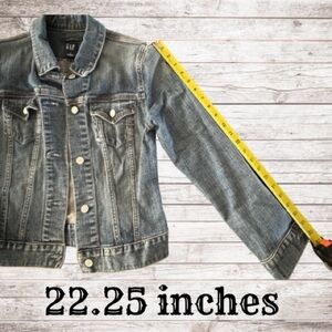 This Gap Women’s Denim Stretch Jean Jacket in size small is in great condition! This is from Fall of 2003, and is made of 98% cotton and 2% spandex. Please see images for specific measurements, but this is a more fitted tailored denim jacket that is super cute over a little top or a dress!