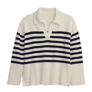 Cream-colored sweater with navy blue horizontal stripes across the chest and sleeves. Features a V-neck with collar, ribbed cuffs and hem, and a relaxed fit. Comfortable and perfect for everyday wear.