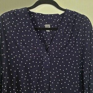 Gap popover flowy blouse with a polka dot pirnt pattern, v-neckline and long sleeves with a single button cuff. Navy blue.
