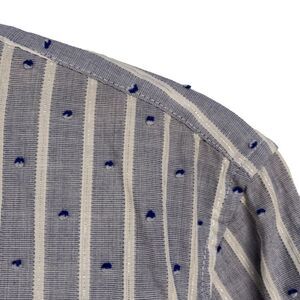 This striped shirt is denim blue and white with a silver metallic stripe running throughout. It has textured dark blue dots. This top is long sleeve and buttons up the front to a collar. this top is made of 99% cotton and 1% other fibers.