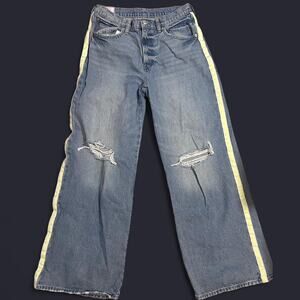 Add a retro touch to your wardrobe with these stylish GAP baggy low rise jeans! Featuring a unique green and white stripe pattern, these jeans are made from 100% cotton for ultimate comfort and durability. Perfect for a casual day out or a fun night with friends.