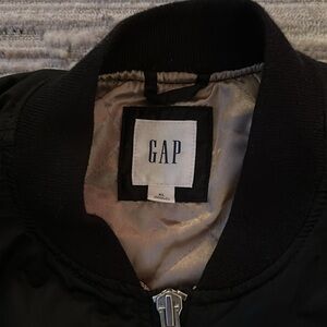 Black satin bomber from gap. Size xl, excellent condition. Zipper pocket on the arms and some internal pockets. Champagne gold interior. Fits TTS