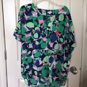 This Gap blouse is 100% polyester. Has cuffed sleeves and a tie neck. Super cute for summer! Like new!