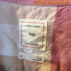 Plaid, slightly fitted Gap button down. Worn a few times. Just a bit short for me (I'm 6'0"). Fun colors! No signs of wear.