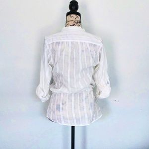 White Gap collarless blouse with tie at the waste. Long, cuffed sleeves that roll up to elbows, with a tab for button. 100%cotton. Super comfortable and hardly worn. Label is XS but fits more like a S/M.