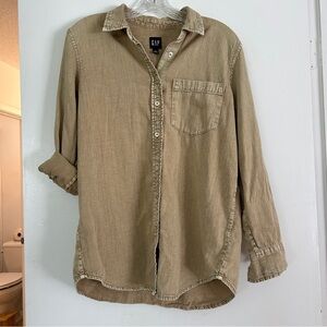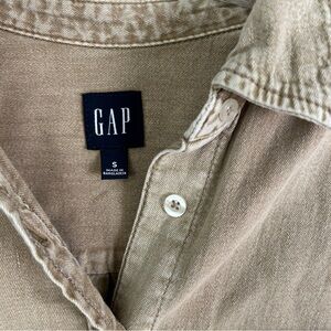 Men’s size small. Gap button up. Long sleeve. Tan denim style. Men’s fitted small or a oversized overshirt for the ladies