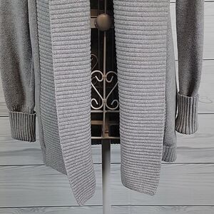Beautiful open front solid grey cardigan by Gap with a ribbed knit shawl front, long sleeves, and rolled up cuffs. Great pre-owned condition.