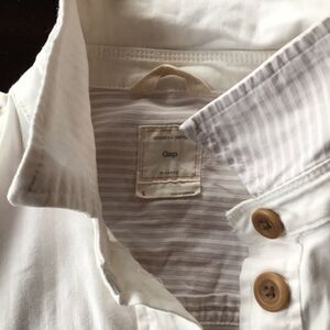 Gap sassy white cream denim jacket with really beautiful texture to the denim. It has great 3/4” caramel buttons and the color and lined yoke with subtle striped cotton fabric