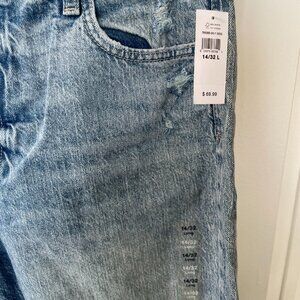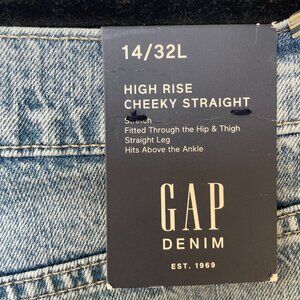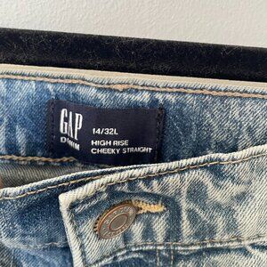 High rise jeans from Gap, straight leg. Fitted through the hip and thigh, hit above the ankle. Medium wash with distressed knees. Never worn.