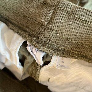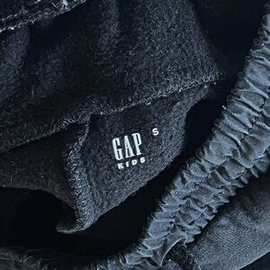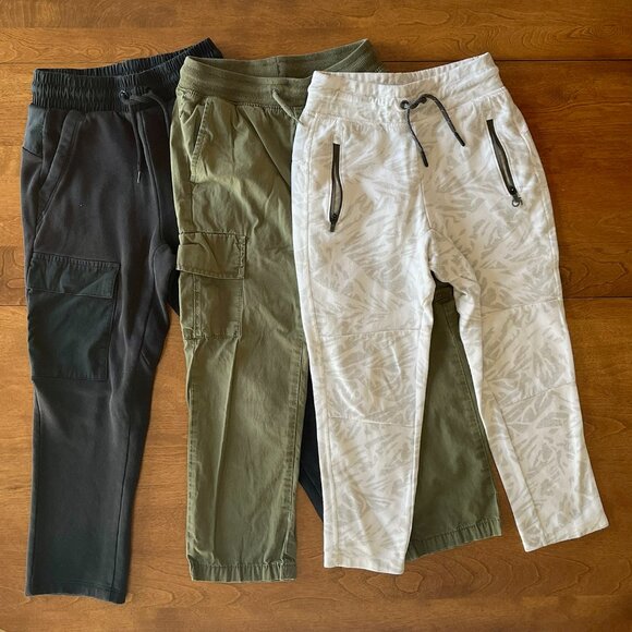 Gap Kids set of three pairs of pants in size Small (6-7): black sweatpants with side cargo pockets and waistband drawstring, white and gray slim-fit athletic joggers with zippered pockets, and olive green poplin pull-on cargo pants. All of these ran a bit on the larger side, more like 7, compared to other Gap pants in the same size. Comfortable and functional styles for everyday wear. GUC with some signs of wear; black pants have some all-over fading, green pants have slight fading/wear and the knees and a worn spot along the top of the waistband, and white pants have faint stain at one knee and larger stain on the back (see close photos).