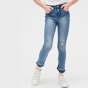 Trendy Gap kids girls high rise destructed ankle jeggings 👖with stretch in a medium wash. These jeans also has the adjustable waistband.