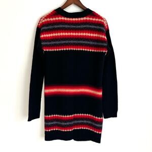 This gap cardigan is in great preowned condition. It is 78% lamb's wall and 22% acrylic. The pattern is primarily dark navy with hot pink and ivory striped patterns zigzags women's size small.