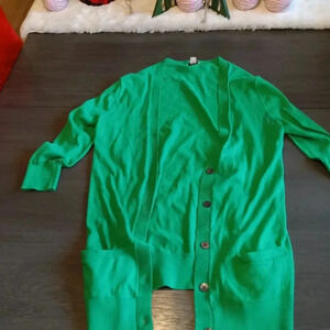 Vibrant green cardigan with button closure. Perfect for layering. Stylish and comfortable.
