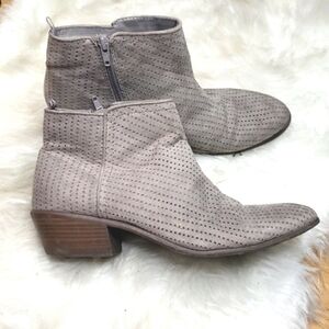 Beautiful grey/taupe suede like ankle boots with perforated pattern have a 1.75” heel and side zippers for easy off and on. So cute! Good condition.