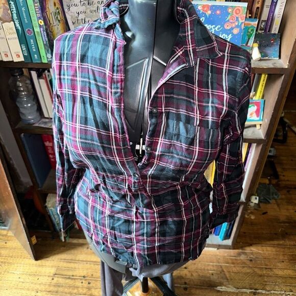 Gap tartan, plaid, flannel, 1/2 button down, cozy shirt. Pairs well with slacks or jeans. So cozy for cool weather! Approximately 21 inches from armpit to armpit, 27 inches long. In good, used condition. From a pet and smoke free house.