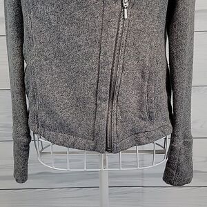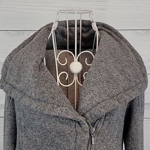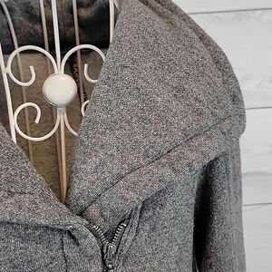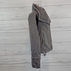 100% cotton sweatshirt jacket with an assymetrical zipper, short silhouette, and an oversized foldover collar. It's a great go-to jacket for a little extra warmth. Good pre-owned condition with normal signs of wash and wear.