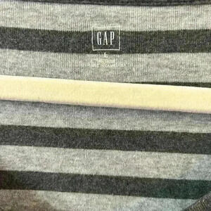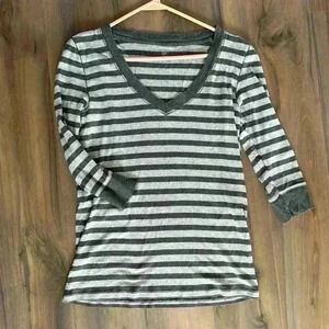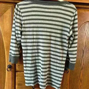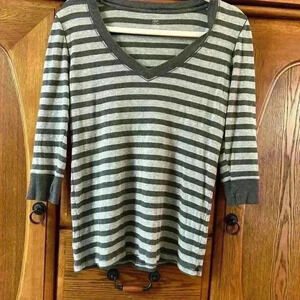 The top is in excellent condition. It is a size large with gray and light gray stripes. The top has 3/4 length sleeves the material is cotton and Modal.