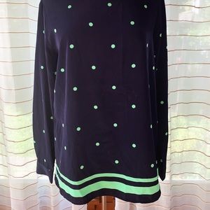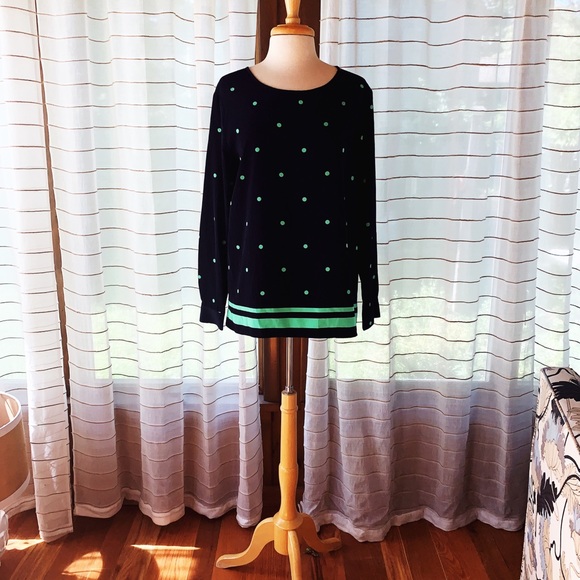 Navy blue with green polka dots and stripe accent. Dress this up with cute green jeans for a great summer look. Necklace not included.