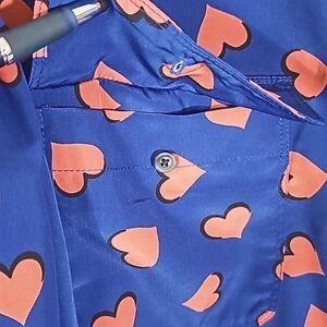 Gap Royal blue with Red Hearts women's blouse 2 chest pockets with flap 1/2 button front long sleeves with button cuffs Size S pit-pit 19.5" sleeves shoulder to cuff 24" length of top shoulder to hem 26"