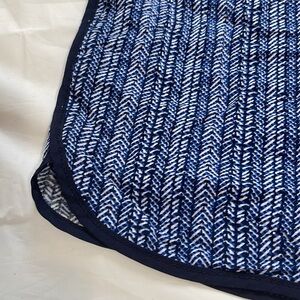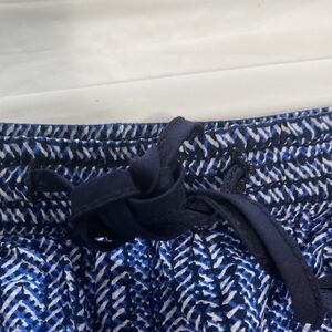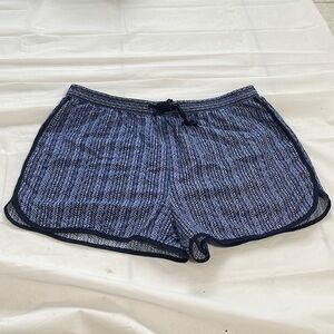 Dark navy blue piping adorns bottom of shorts and up the sides.
