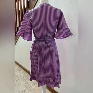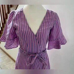 Gap | women’s wrap dress. Size: XS Petite. 55% linen, 45% cotton. Colors: baby pink and blue. Wrap style dress. Ruffle hem, short, flutter sleeves. Hook/eye closure on front. There is one spot that is a little lighter on the front, barely noticeable- but- see picture. Good, used condition. Perry dress! Perfect for spring.