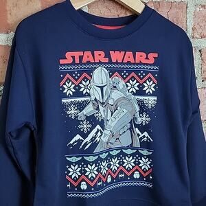 Fun Christmas holiday pajama set from the Gap x Star Wars collaboration. Set includes a long sleeve top and elastic waist pants. Features the Mandolorian and other Mando graphics in a fair isle design. We love the little Grogu heads. Made from 100% polyester in a navy blue. The fabric is thin and lightweight. New with tags attached with manufacturing defects: The legs measure about a 1/2" difference. There is a small area of over-stitching on the shirt near the hemline. Both shown in pictures. They do not interfere with functionality. No visible holes or stains. In kid's size 4.