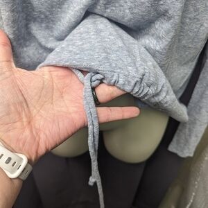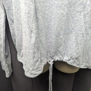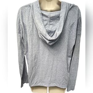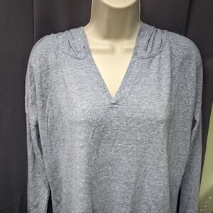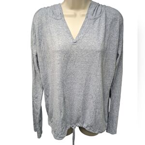 This hoodie is in gently used condition. It is a light jersey knit material. It has a heathered coloring. The waist is a drawstring style. The fit is loose and comfortable. Please see photos for details.