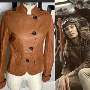 Gap Brown Leather Asymmetrical Button Up Vintage style Moto Aviator Jacket Sz Small