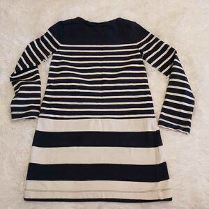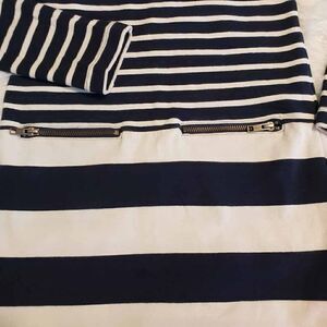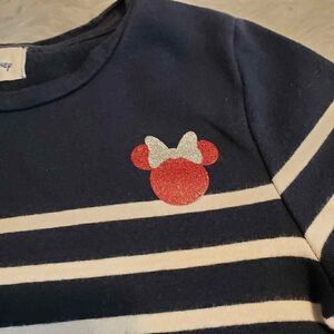 EUC girl's long sleeve navy and white striped knit dress size medium(8) with an outline of Minnies head on front in coordinating red and silver glitter. Pullover style