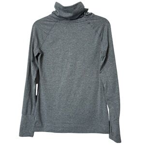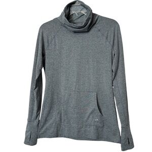 Comfy and sleek GapFit activewear pullover top. Features heather gray micro-stripes, cowl neckline, thumbhole sleeves, and front kangaroo pocket. Super soft stretch fabric—great for warming up, layering, or lounging. Size Small.
