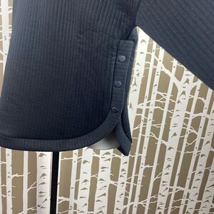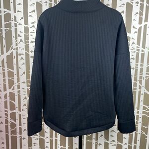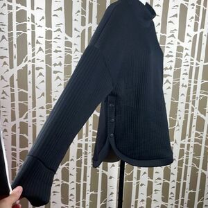GapFit Jacquard Pull Over Ribbed Side Snap Mock Neck Sweatshirt sz L True Black. Features a thick black ribbed Jacquard fabric (98% polyester, 2% spandex), mock neckline, curved split hemline with 3 fully functional snaps on each side, banded cuffs, drop style sleeves. Worn once and clean with no flaws to note. This is such a nice and substantial piece - perfect to throw on any time you just need to take the chill off and want to be cozy! This retailed for $80 new - grab this worn just once piece for a fraction of the price of new!