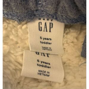 Blue sweatsuit. Faux fur Sherpa hoodie full zip jacket with white “Gap” logo on front. Kangaroo pocket. Long sleeve with banded cuff. Jogger pants with elastic waistband. 60% cotton/40% polyester. Lining: 100% polyester. Imitation fur: 67% 17% modacrylic/16% polyester. Size: 5 years. Preowned in good condition.