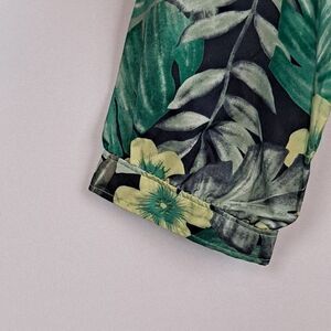 Beautiful spring jacket! Green, yellow and white palm design, size xs. Full zip front with snap placquerd overlay. Stand collar, drawstring bottom.