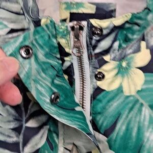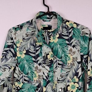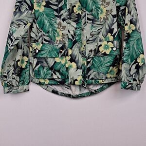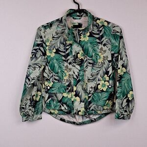 Beautiful spring jacket! Greens yellow and white palm print, size Xlarge. Full zip front with snap placquerd over. Stand collar drawstring bottom and 2 front snapped pockets