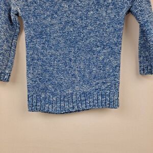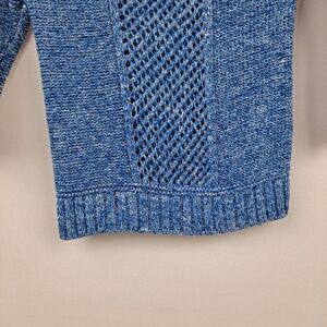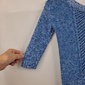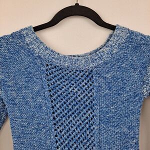 Shades of blue, size medium. Boat neck, open weave front panel, ribbed neckline, bottom and sleeve bottoms. Beautiful! Nice weight. Measures 16" pit to pit, length is 19.5"