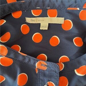 GAP Henley style button front navy/orange polka dot shift style dress size M. Long sleeves with button cuffs, two chest pockets with buttons. Rounded bottom hem, 100% polyester. Approximate measurements are pit to pit 20”, length from shoulder approximately 36”.
