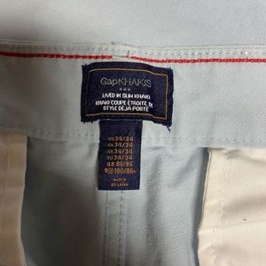 GapKhakis Light Blue Lived in Slim Khaki. Item in good preowned condition. Approximate measurements laying flat: Waist: 17.5” Inseam: 33”