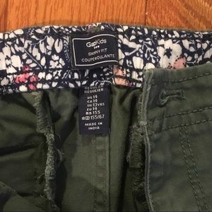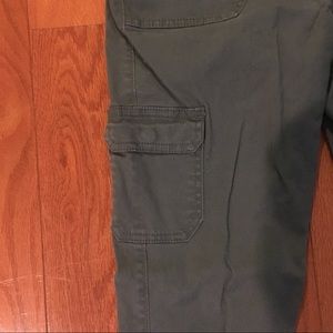Olive green cargo pants with front zipper and button/buttonhole. Two front and back pockets as well as one side cargo pocket. Extra zipper detail at ankle with option to show flower fabric detail. Elastic back waist. 97% cotton 3% spandex, machine wash tumble dry. I have the same pants in slate gray, if interested please let me know, will be posting soon.