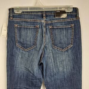 Dark blue wash, size 4/ 27. Classic 5pocket style with straight legs and zipper fly front with button. Fabric is 71 cotton, 27 polyester and 2 spandex. Measures 28" waist, 9" rise, inseam is 30".