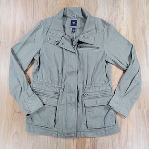 Gap olive green utility jacket. Zip up and snap button closure with 5 front pockets. 3 with zipper closure and 2 with snap button closure. Interior tires to cinch the waist for a perfect, customized fit.