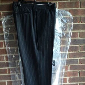Classic Fit flat front, pinstripe Chino Pants. Black with gray stripes. Side slant pockets, invisible back slit pockets.