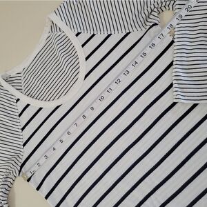 Vintage wash scoop-neck by Gap has 3/4 length raglan sleeves and a curved hem. Varying black stripes on off-white give interesting detail. A fun top in great shape!