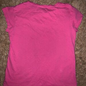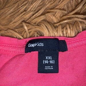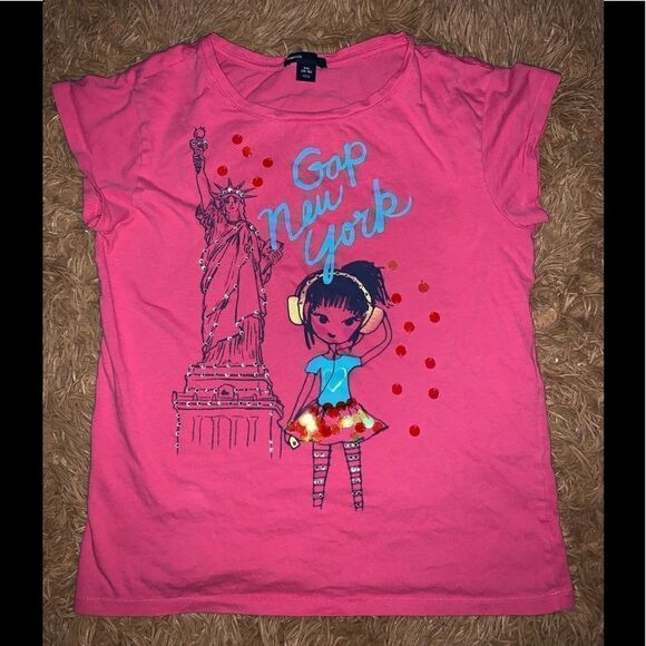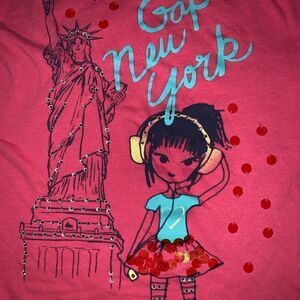 Gap Kids Short Sleeve Top. Short sleeve top with “Gap New York” on front. Statue of Liberty and girl wearing headphones design with rhinestones throughout. Stretch material. Color: pink. 100% cotton. Size: XXL (14-16). Preowned in good condition.