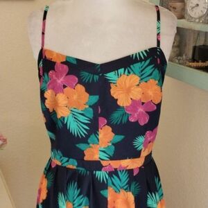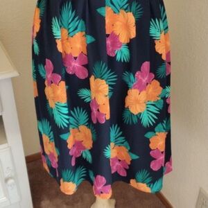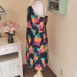 A tropical inspired sun dress is perfect for sunny days. The bodice is lined, has supports at the sides and elastic shirring at back. Sweetheart neckline. Adjustable straps. Pleats on skirt at front, gathers in back. Size 18 measures 42-48 at chest, 38 at waist. Full skirt, 50 at hips. 41 long from shoulder to hem. Like NEW. Go ahead and have fun!