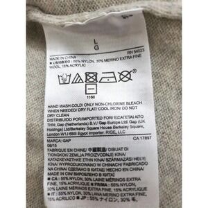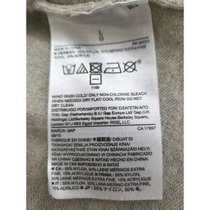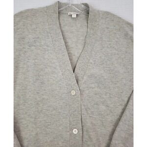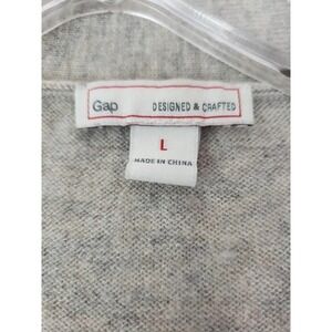 This gray Gap sweater cardigan is perfect for any occasion, whether you're dressing up for work or keeping it casual while traveling. The V-neckline and long sleeves provide a classic look while the tight-knit wool blend fabric keeps you warm in the fall, winter, and spring seasons. The cardigan features buttons and pockets for added style and convenience. It is a regular fit and comes in size L for women. The sweater is pre-owned but in excellent condition.
