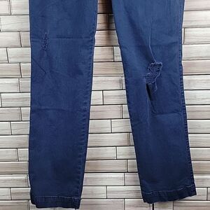 98% cotton spandex blend low rise skinny style pant manufactured distressed. Two front seamed pockets with coin pocket detail and to back slit pockets. Good pre-owned condition.