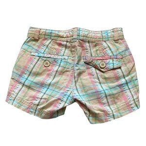 Cute yellow plaid shorts with an adjustable waistband and a slide clasp for closure.