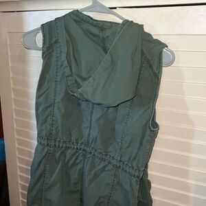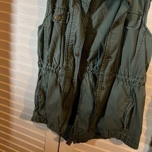 Gap small sleeveless hooded vest, olive green, snap pockets on the front, open pockets on the bottom, has elastic both at the waist and at the very bottom, full zip and snap closure, Sleeveless, Hooded, size small, made of 100% cotton, measures 18 inches pit to pit with an overall total length of 25 inches